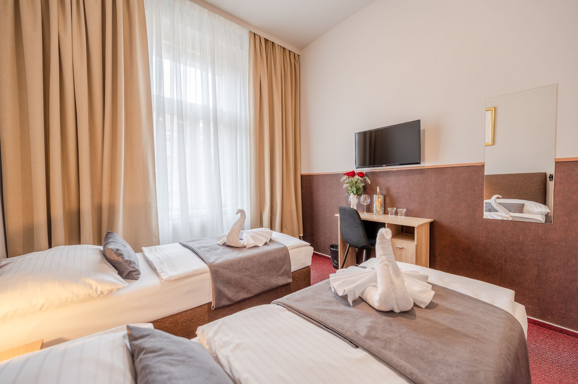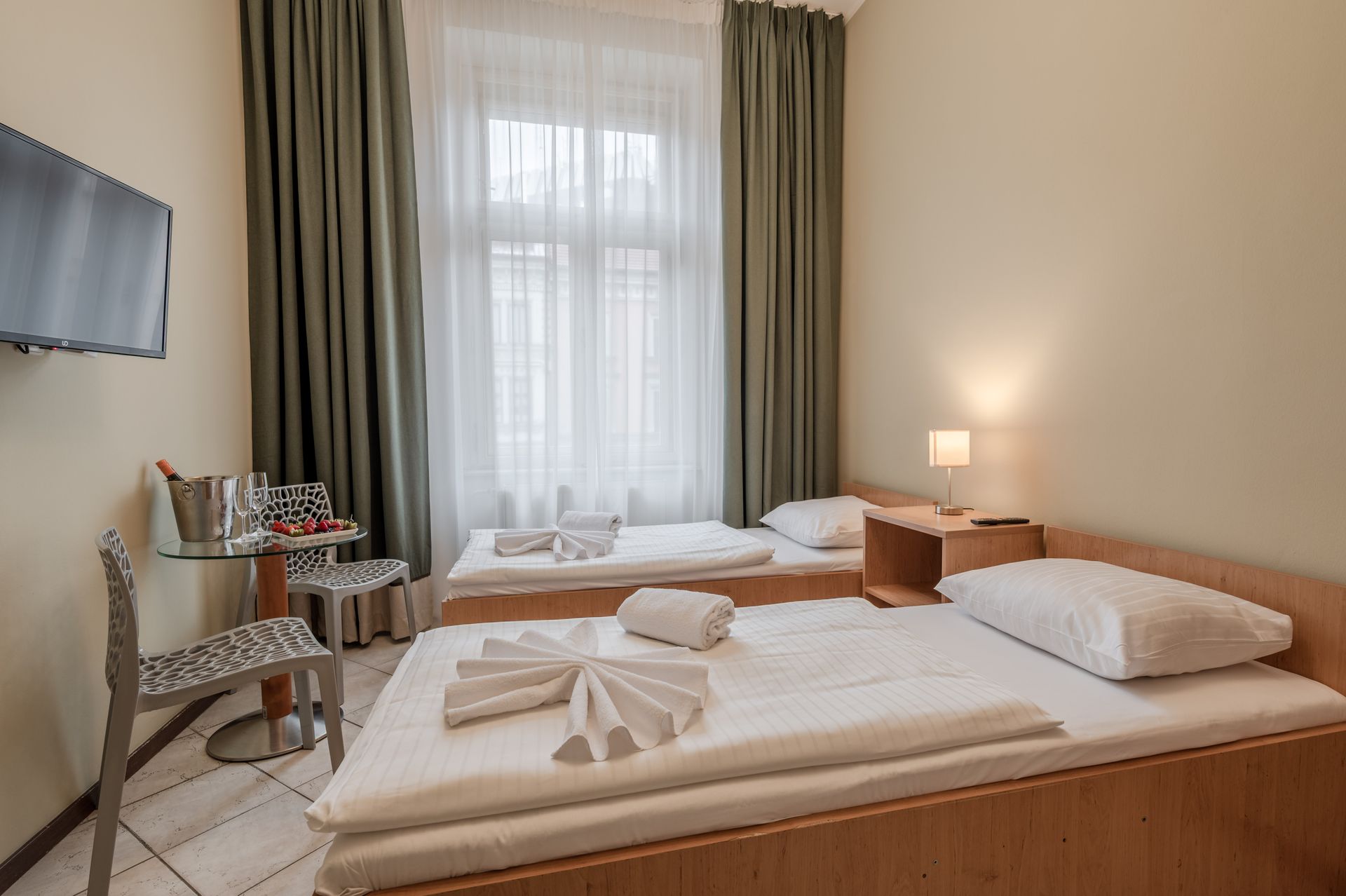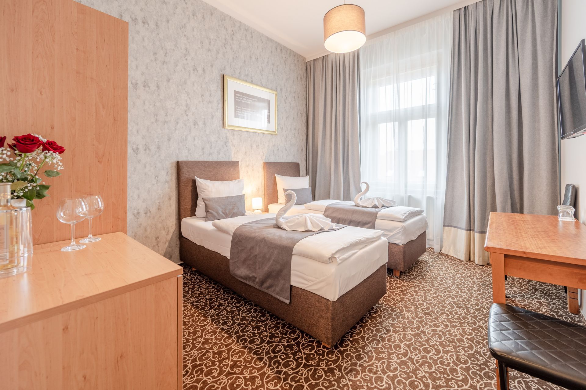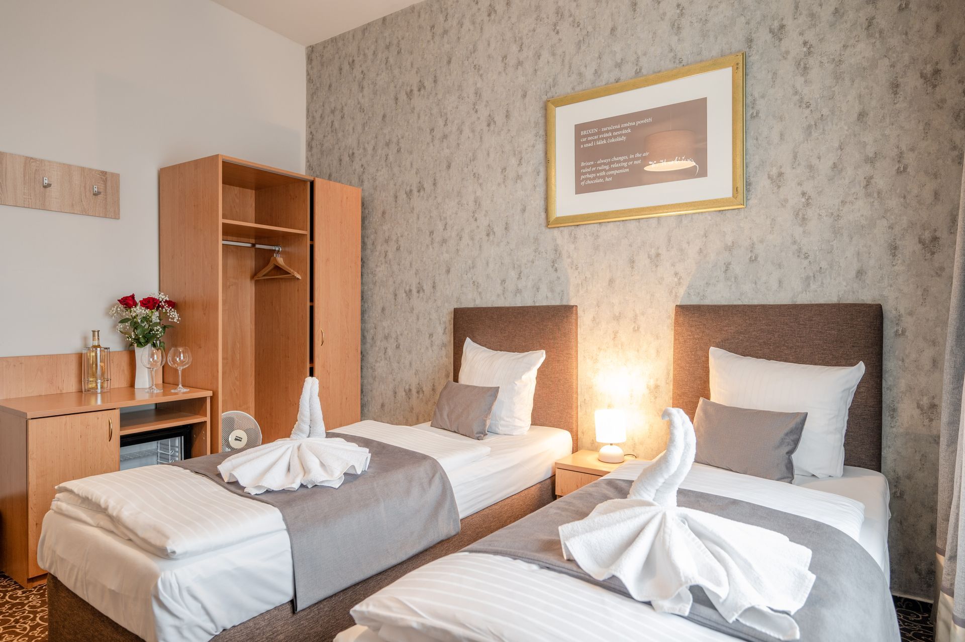 Pohodlný a světlý dvoulůžkový pokoj s oddělenými postelemi, ideální pro dvě osoby. Pokoj je vybaven vlastní koupelnou se sprchovým koutem, fénem a toaletními potřebami zdarma.